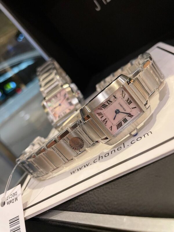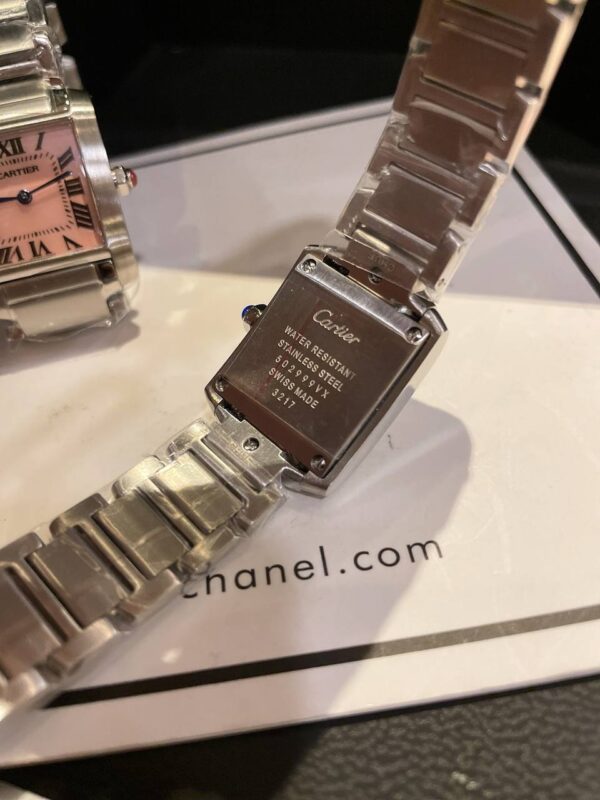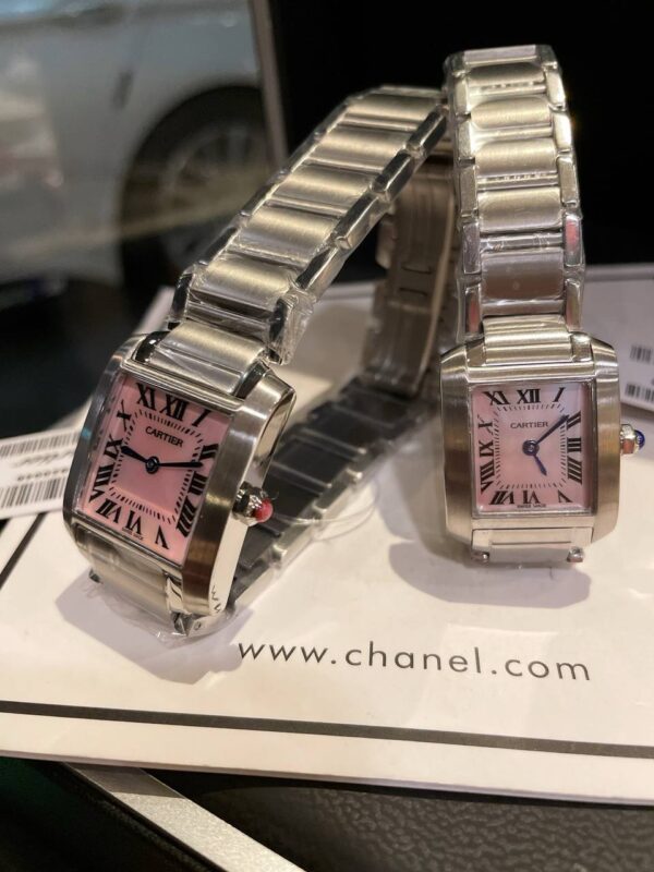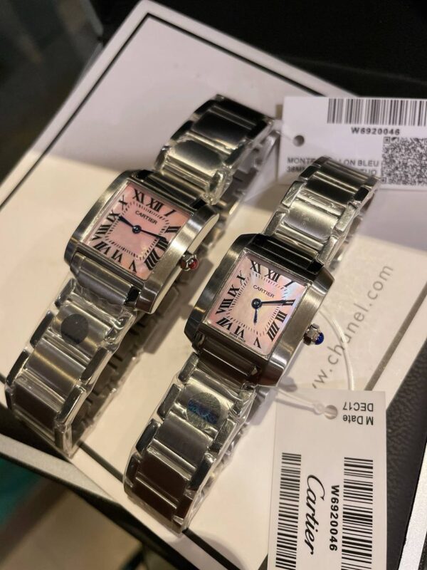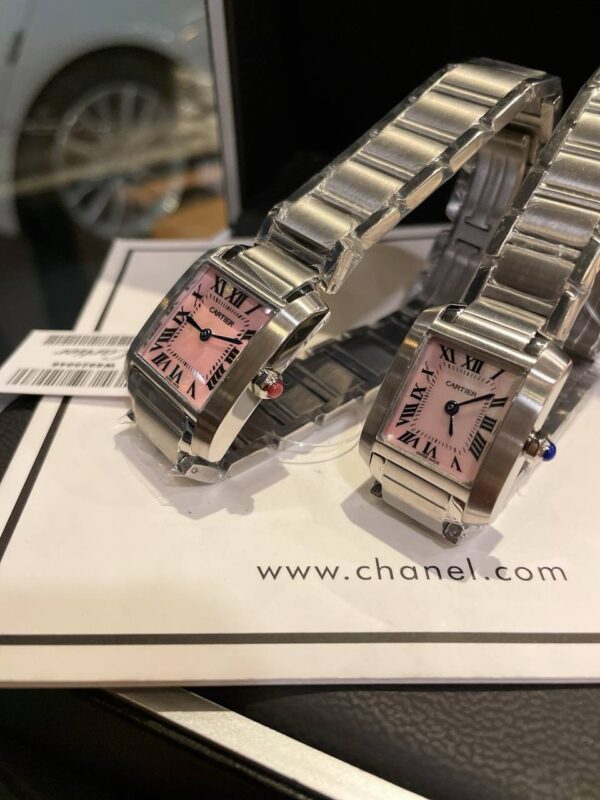 An exquisite two-piece Cartier Tank Française replica watch set featuring pink mother-of-pearl dials, Roman numerals, and Swiss quartz precision.
