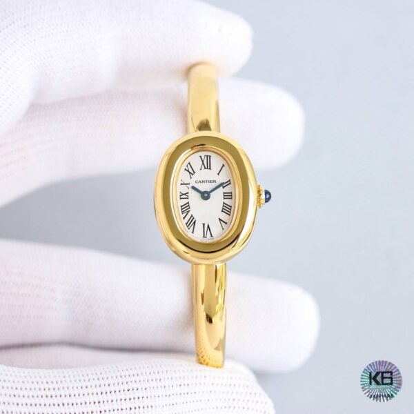 This Cartier Baignoire Mini replica features the collection’s signature elongated oval-shaped case, which curves delicately around the wrist. The smooth, mirror-polished finish of the yellow gold-tone stainless steel case lends a sense of quiet sophistication. Measuring approximately 23mm x 31mm, it strikes the perfect balance between elegance and femininity—ideal for petite wrists or those who prefer understated luxury.