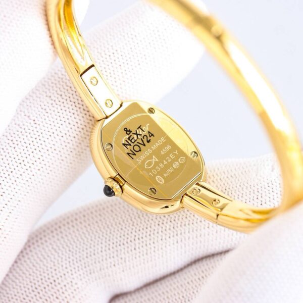 Unlike larger statement watches, the Baignoire Mini is designed to act as a refined piece of jewelry as much as a timekeeper. The case integrates seamlessly into a rigid gold-tone metal bracelet, which wraps snugly around the wrist, creating a streamlined, elegant silhouette.