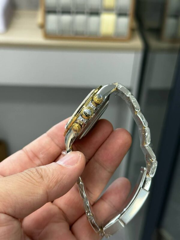 The Rolex Daytona two-tone gold white dial replica blends motorsport heritage with high-end finishing. A radiant white dial with gold sub-dials sits beneath a yellow-gold tachymeter bezel, while a 40 mm steel case with gold accents keeps proportions timeless. Luminous markers, sapphire-style crystal, and screw-down style pushers complete the tool-watch brief. Inside, a dependable automatic-style (or quartz, depending on batch) chronograph delivers smooth start/stop/reset action. The two-tone Oyster-style bracelet adds confident wrist presence and secure comfort for business, evenings out, and weekend drives alike.